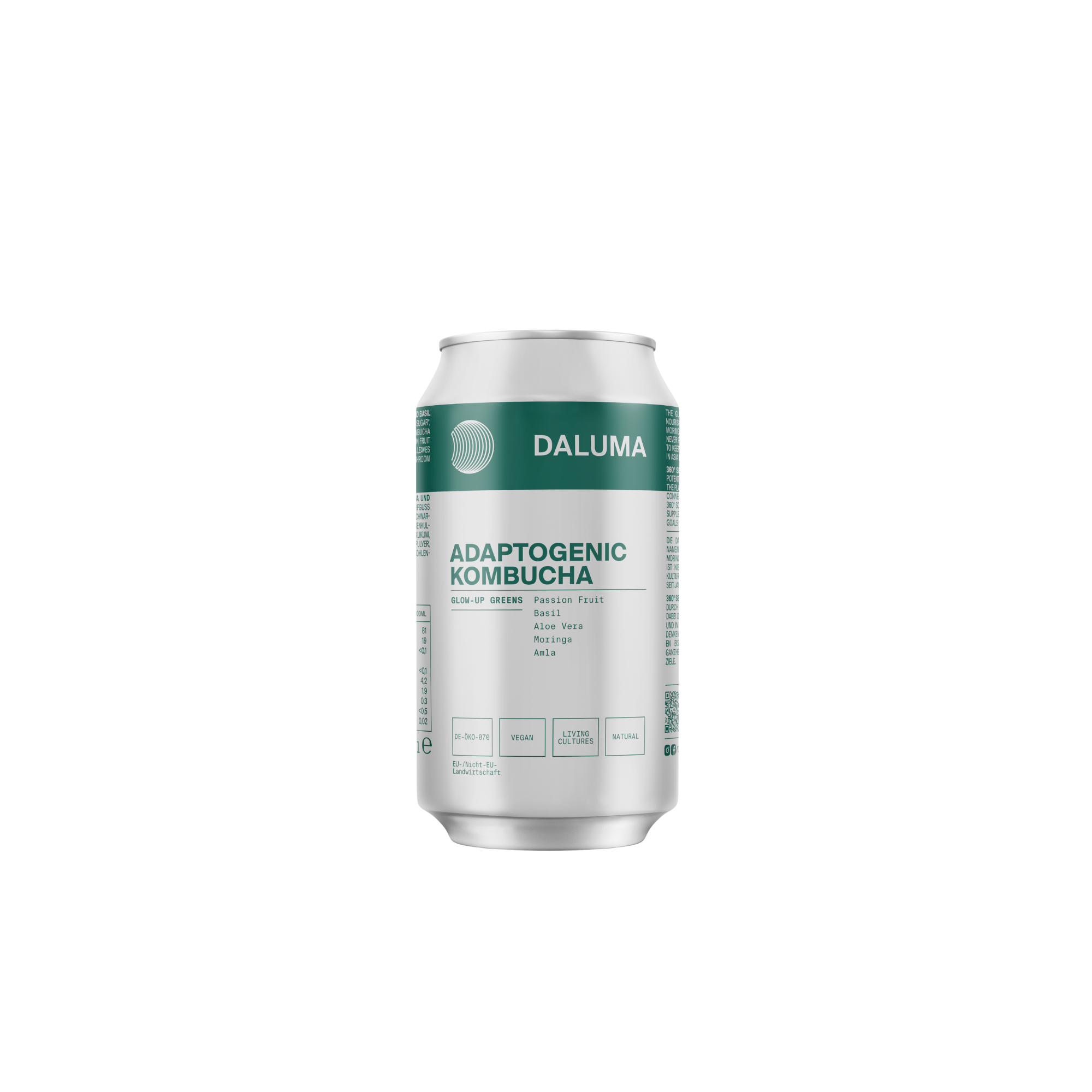GLOW UP GREENS KOMBUCHA: fermentierter tee-aufguss (wasser, zucker*, grüner-tee* jasmineblütte*, schwarzer tee*, kombucha-kultur* (hefe*- und bakterienkul-turen), maracujasaft, aloe vera pulver, basilikum, moringa oleifera blatter pulver*, amla pulver, bacillus subtilis, pilz extrakt (glykolipide), kohlen-säure.
